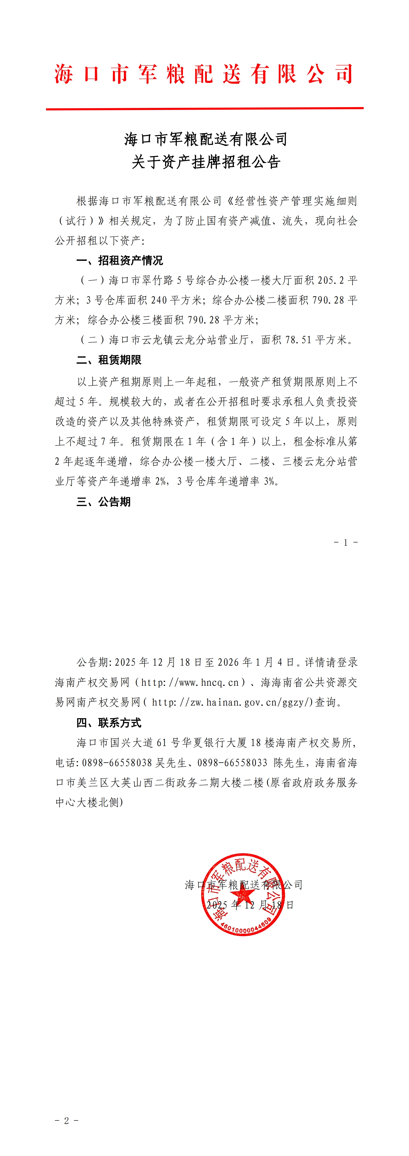 海口市军粮配送有限公司关于资产挂牌招租公告