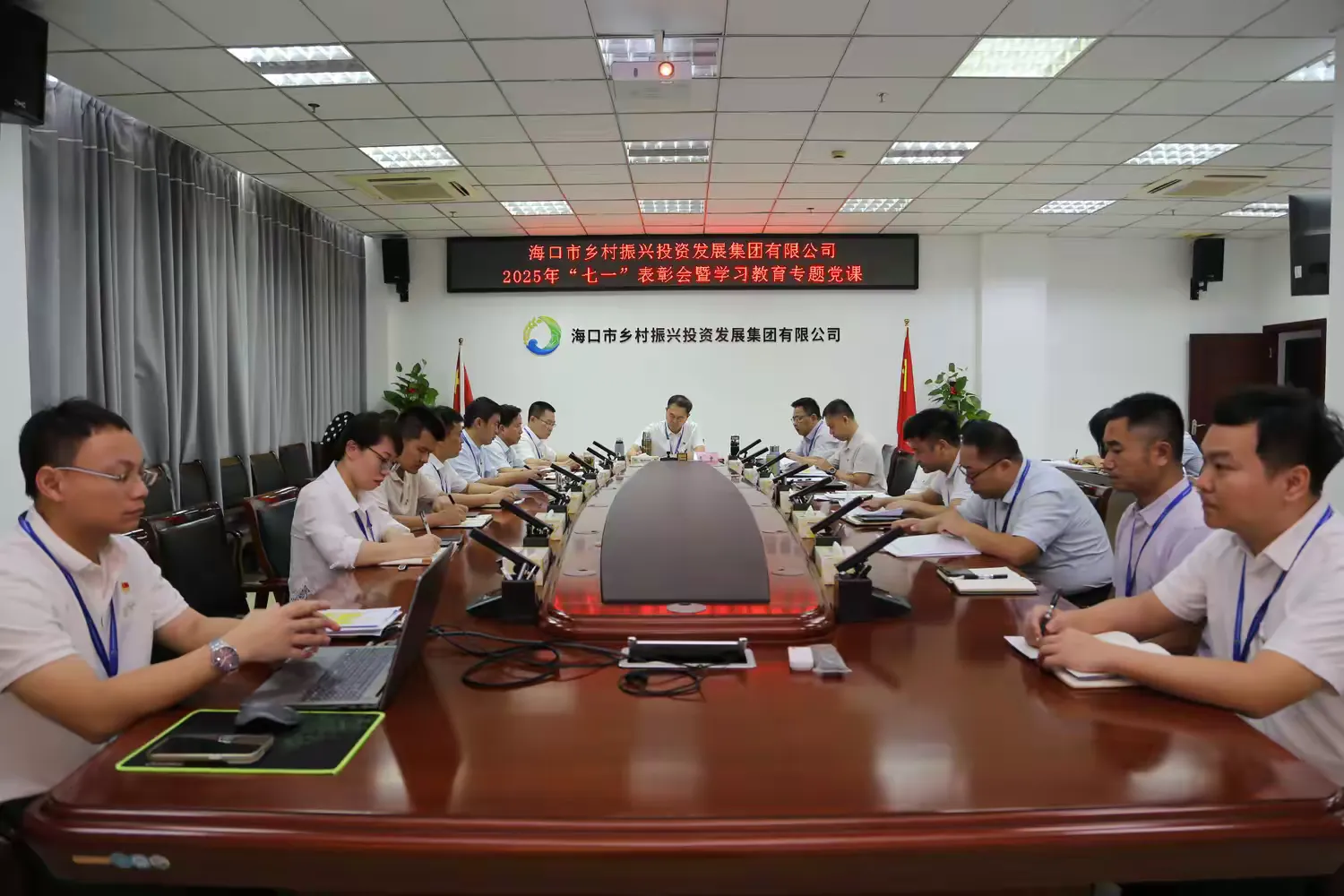 为热烈庆祝中国共产党成立104周年,引领广大党员干部铭记党的光辉历程、颂扬党的伟大成就、传承党的优良传统,进一步激发全体党员干部奋勇争先、建功立业的热情,充分发挥党员先锋模范与基层党组织战斗堡垒作用,2025年7月1日,海口市乡投集团成功召开2025年“七一” 表彰会暨学习教育专题党课。集团党委书记、董事长陈忠出席会议并讲授专题党课,集团党委副书记、工会主席周经业主持会议。